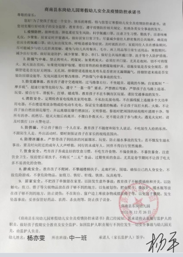 園寒假幼兒安全及疫情防控承諾書》內(nèi)容,組織家長在承諾書上簽字,明確家長假期安全監(jiān)管職責(zé),夯實(shí)安全監(jiān)管責(zé)任。