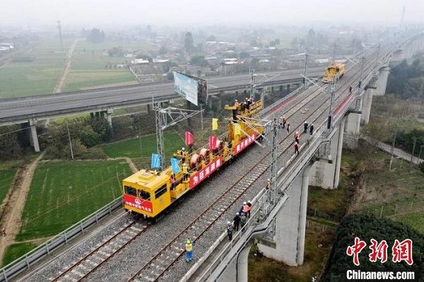 成蘭鐵路成都至川主寺(黃勝關(guān))段接觸線架設(shè)現(xiàn)場。成蘭鐵路公司供圖