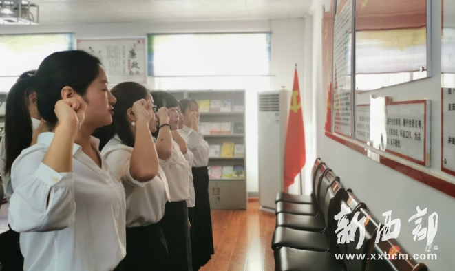 活動第一項:重溫入黨誓詞。在黨支部書記袁萍同志的帶領(lǐng)下,在場的黨員同志們一起重溫入黨誓詞,黨旗飄飄、誓言嘹亮,簡短而有力的誓言,深深地烙印在每名同志心中。