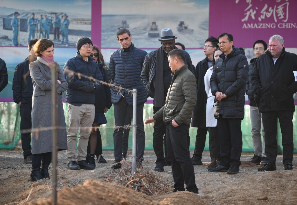 ▲駐華使節(jié)在寧夏銀川市永寧縣賀蘭神國際葡萄酒莊了解賀蘭山東麓釀酒葡萄冬季埋藤的原因(11月21日攝)。新華社記者 馮開華 攝