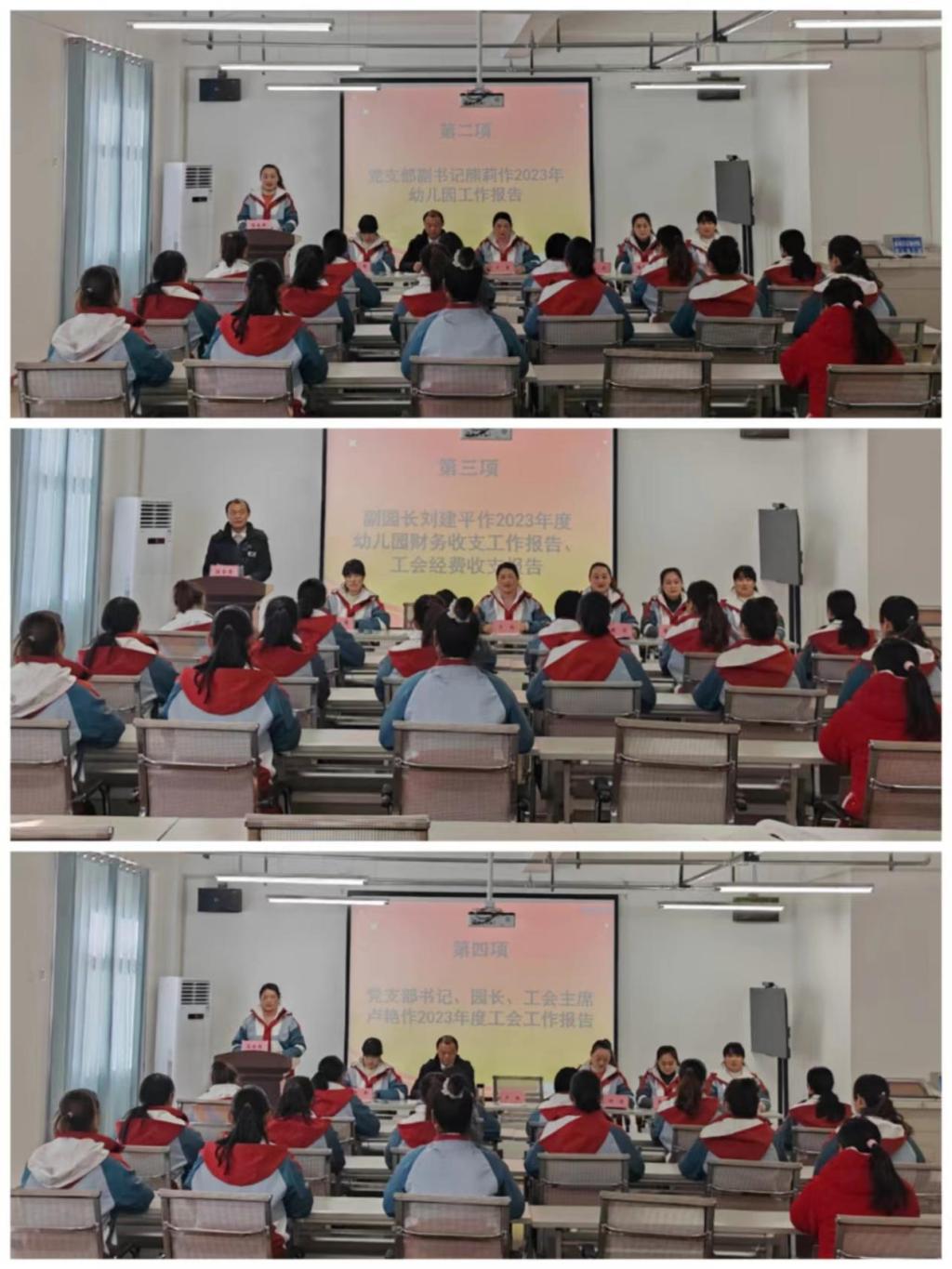 熊莉作2023年度園務(wù)工作報告,劉建平作2023年度財務(wù)收支報告、工會經(jīng)費收支報告,盧艷作2023年度工會工作報告。與會人員通過舉手表決的形式,對該園2023年度四大工作報告進行了審議,全票通過。