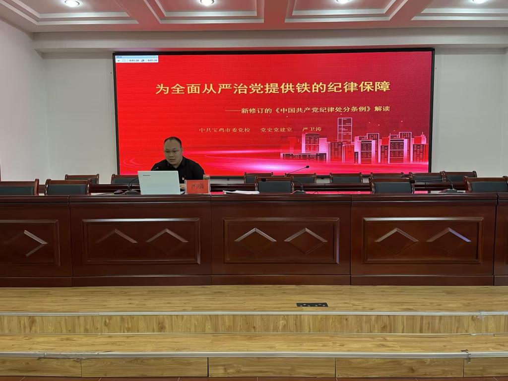 專家解讀學黨紀。邀請市委黨校黨史黨建室講師嚴衛(wèi)濤以《為全面從嚴治黨提供鐵的紀律保障》為題,從《中國共產(chǎn)黨紀律處分條例》修訂背景及要求、新增及修改的重點條文和如何貫徹落實《條例》三部分進行了深入淺出的解讀,為全鎮(zhèn)黨員干部全面掌握《條例》內(nèi)容和精神實質(zhì),更好的學習、理解和運用條例,奠定了理論基礎(chǔ)。全體參訓人員集體觀看了警示教育片《迷失的心》,進一步筑牢拒腐防變的思想防線。