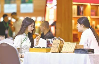 展商們?yōu)橛^眾沖泡著杯杯香茗,盡情展現(xiàn)自家產(chǎn)品的色香味。同一種茶,現(xiàn)場可以喝到不同產(chǎn)區(qū)、不同原料、不同工藝的茶品,眾多觀眾時(shí)時(shí)舉杯品茗,沉醉于自己喜愛的茶品之中。