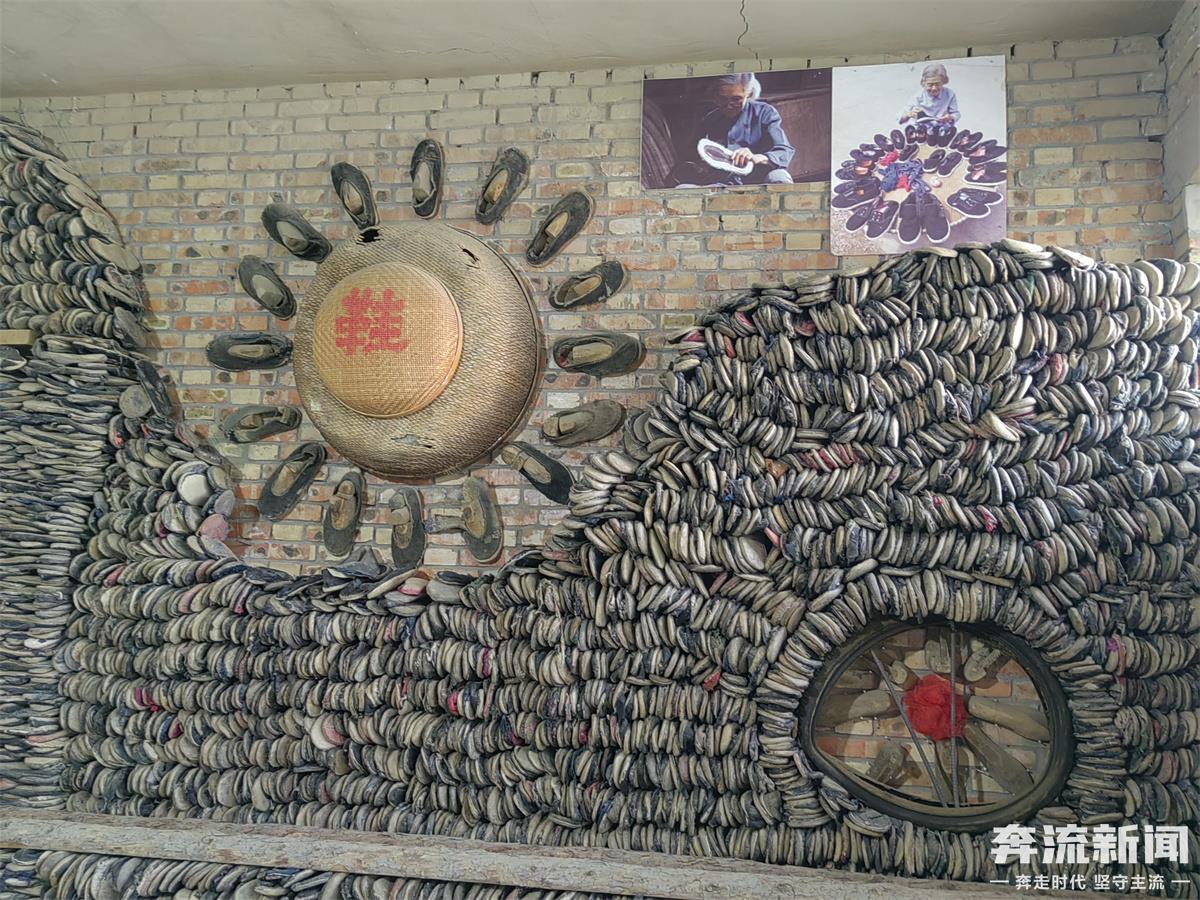 在民俗博物館,有一面“萬(wàn)鞋墻”引人注目,成千上萬(wàn)雙穿用過(guò)、作廢了的破舊鞋子,如幾何圖形般擺成了一地一墻的花壇浮雕,記錄著陜北人在山峁高梁行走的千辛萬(wàn)苦。