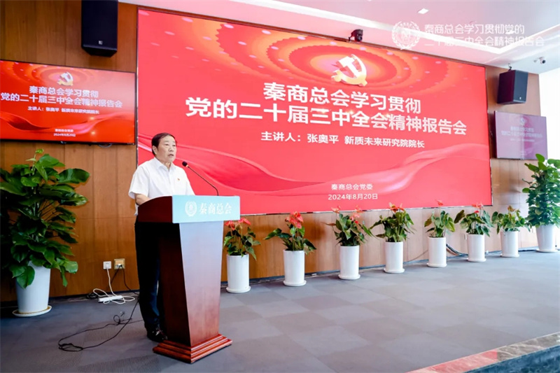 8月20日,秦商總會(huì)黨委組織召開(kāi)學(xué)習(xí)貫徹黨的二十屆三中全會(huì)精神報(bào)告會(huì),新質(zhì)未來(lái)研究院院長(zhǎng)張奧平做主題為《“推進(jìn)中國(guó)式現(xiàn)代化的‘立’與‘破’”》的報(bào)告。陜西省委社會(huì)工作部二處負(fù)責(zé)人柴廣榮講話,秦商總會(huì)黨委書(shū)記劉阿津主持本次報(bào)告會(huì)。秦商總會(huì)部分常務(wù)副會(huì)長(zhǎng)、副會(huì)長(zhǎng)等會(huì)員代表、陜西省康養(yǎng)產(chǎn)業(yè)協(xié)會(huì)會(huì)員及新聞媒體等120余人參加本次報(bào)告會(huì)。
