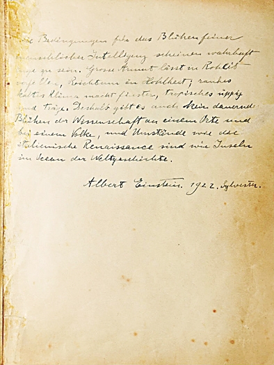 “人類(lèi)智慧花朵的綻放的確受到了嚴(yán)重限制。貧窮導(dǎo)致人民生活水平低下,而富有又導(dǎo)致人民內(nèi)心空虛:嚴(yán)寒的天氣使人沉郁,而炎炎烈日又會(huì)使人驕奢淫逸、昏昏欲睡。這就是一個(gè)國(guó)家或地區(qū)不能使知識(shí)的花朵始終保持盛開(kāi)的根本原因,也是能夠解釋意大利的文藝復(fù)興就像是歷史海洋中的一片小島的直接答案。”1922年除夕,愛(ài)因斯坦短暫停留上海之際,在一對(duì)長(zhǎng)期旅居上海的猶太人特里薩·倫納夫婦家中居住,并在留言冊(cè)的首頁(yè)寫(xiě)下這段話。