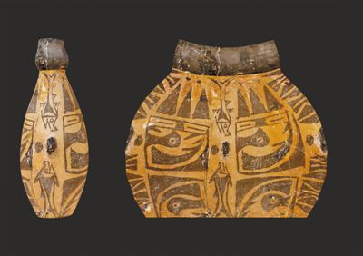 陜西姜寨遺址出土鳥魚紋彩陶葫蘆瓶及紋飾展開圖。