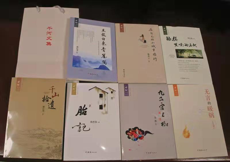 《千河文集》共7本,由團(tuán)結(jié)出版社出版發(fā)行。分別是:楊江海的《千山拾遺》、楊惠強(qiáng)的《胎記》、楊紅芳的《且放白鹿青崖間》、朱維的《九品官上樹》、王艾迎的《無言的暖鍋》、魏愛云的《在自己的小城里旅行》、鄭江泉的《觸摸呢喃的土地》。
