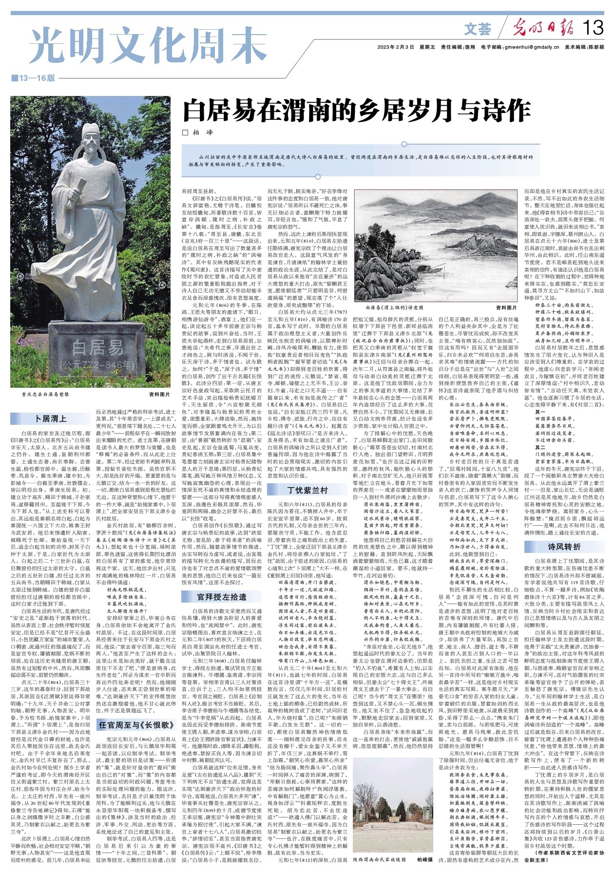 貞元二十年(804),白居易三十三歲,這年的暮春時(shí)分,回到下邽故居,其原因在《泛渭賦》里說(shuō)得非常明確:“十九年,天子并命二公對(duì)掌鈞軸,朝野無(wú)事,人物甚安。明年春,予為校書郎,始徙家秦中,卜居渭上?!彼^“卜居渭上”,是指歸居下邽縣義津鄉(xiāng)金氏村——因?yàn)榇说卦?jīng)是漢代金日磾?shù)姆獾?,也許是其后人聚攏居住在這里,故名金氏村吧。由于千余年來(lái)地名沿革變化,金氏村早已不復(fù)存在了,那么,金氏村如今在何處呢?據(jù)鄉(xiāng)土學(xué)者嚴(yán)謹(jǐn)?shù)目甲C,即今天的渭南經(jīng)開區(qū)信義街道紫蘭村。紫蘭村原名上太莊村,前些年因?yàn)榇迩f合并,始為今名。上太莊的村西,早先有一座興福寺,從20世紀(jì)80年代發(fā)現(xiàn)的《重修紫蘭寺告竣碑記》得知,石佛“能以身之潤(rùn)燥徵歲時(shí)之豐歉,白公感其靈,乃制紫衣以獻(xiàn)之,始更名為紫蘭寺”。
