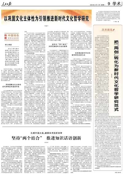 文化主體性集中體現(xiàn)人在文化活動中的自覺意識和自主立場。深化新時代文化哲學研究,需要以鞏固文化主體性為引領,以“兩個結合”為研究路徑和方法論指導,為建設中華民族現(xiàn)代文明提供哲學智慧滋養(yǎng)。