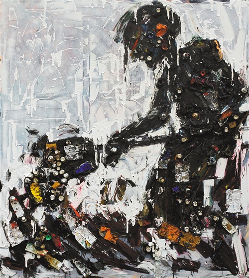 聶正杰說,《存在》畫的是農(nóng)民工,卻折射出了他當(dāng)時的心境:灰色調(diào)代表那時候的困頓狀態(tài),而那一點藍(lán)色天空,則代表了對未來的希望。
