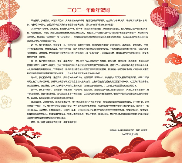 律回春暉漸,萬象始更新。翹首展望2021年,我們將迎來中國共產(chǎn)黨百年華誕,黨和國家事業(yè)將全面開啟新征程。對于我們院,這也將是極不平凡的一年。我們將全力推進新院區(qū)建設(shè)、大刀闊斧地建設(shè)新型智庫、積極爭取哲學(xué)社會科學(xué)創(chuàng)新工程落地實施。叩問初心,我們?nèi)沃氐肋h。追逐夢想,仍需堅毅前行。在新的一年里,讓我們以習(xí)近平新時代中國特色社會主義思想為指導(dǎo),繼續(xù)綰褲涉水、擼袖實干,勇做知重負(fù)重的先行軍、知難克難的攻堅手、知責(zé)盡責(zé)的擔(dān)當(dāng)者,攜手齊奮進,闊步新征程,共同書寫陜西省社科院更加美好的華彩篇章,以更加優(yōu)異的成績向黨的百歲生日敬獻厚禮!