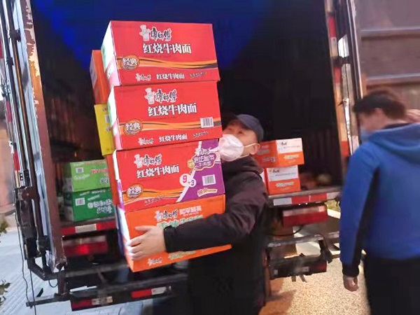 1月10日,為外來務(wù)工人員送救災(zāi)食品。志愿者們將一批救災(zāi)食品送到外地來打工的5個工地的臨時居住點。