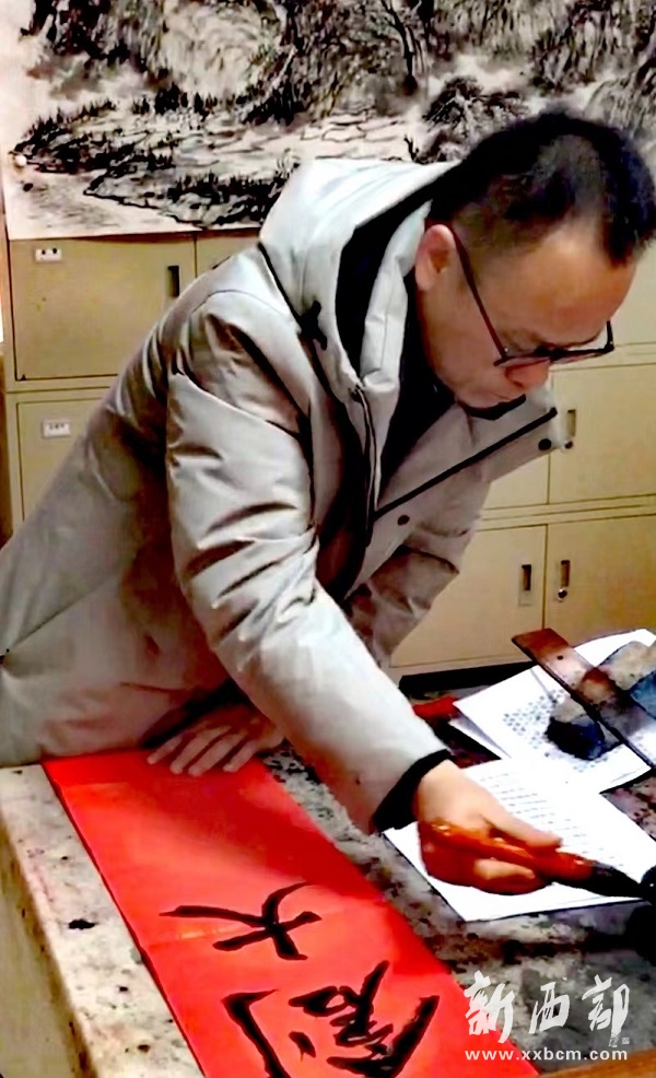 馬建飛副研究員在書寫春聯(lián)
