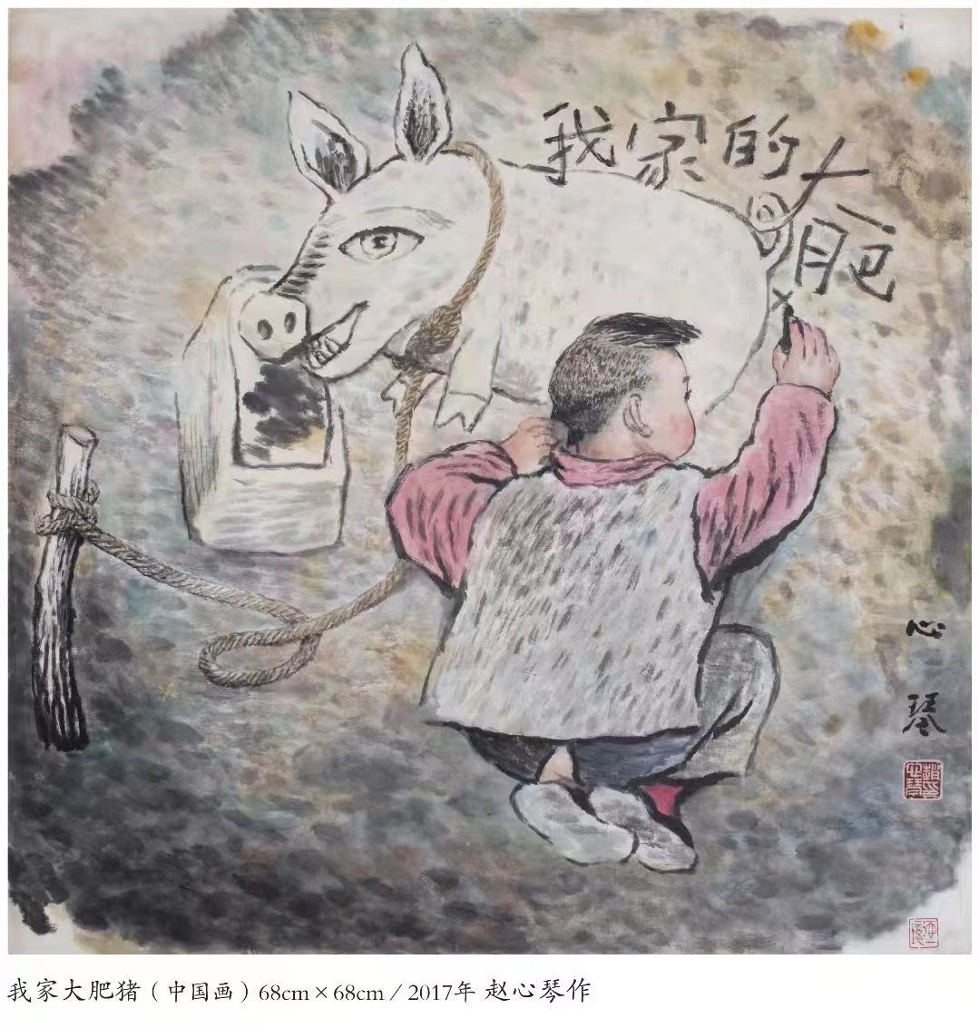 趙心琴出生在美麗的小江南陜西安康,在鄉(xiāng)下種過地,插過秧,干過很多農(nóng)活,她從小深受大自然的熏陶,喜歡作文畫畫,這種根植于骨子里的樸素情懷,為她以后的藝術(shù)創(chuàng)作埋下伏筆和帶來靈感。她的作品,常用人性化的眼光觀察動物與景觀,大量使用夸張、擬人手法,豐富的想象力,形成了她獨特的創(chuàng)意繪畫風(fēng)格;她的作品,既粗獷、豪放,又自然、溫馨,充滿童真、童趣,表現(xiàn)了愛的甜蜜、家的溫馨、人民生活的幸福。在作品《我家大肥豬》和《農(nóng)家娃》中,作者以“夸張”的筆法,生動地展現(xiàn)了生活中常見的人與動物主題,同樣是豬和牛的形象,但在作者筆下這些動物卻有著與人對視的大眼睛,大身體,這種看似不協(xié)調(diào)的人物形象,卻又充滿著一種固執(zhí)和向往,這種固執(zhí)是很多男孩子對超人夢和美好生活的追求,相信無論多少歲,男生心目中仍然有著成為超人和對美好日子的夢想。這種“超人夢想”,男孩子們有,趙心琴也有。