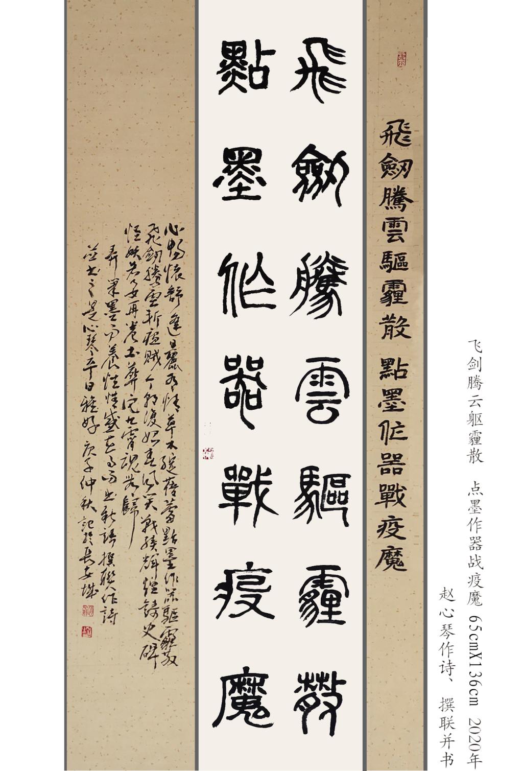 趙心琴是一個近乎“完美”的綜合性書畫藝術(shù)家,她不但作文、跳舞獲過獎,在中國畫創(chuàng)作上有自己的意象圖騰和想法,而且在書法、工筆畫和版畫創(chuàng)作上,也有自己的建樹,特別是在書法創(chuàng)作上,她用自己名字中的“心琴”二字撰寫并書法的近千幅嵌名藏頭對聯(lián),真讓人拍手叫絕。當(dāng)然,作文的難度很大,沒有一定的文化積累和綜合素養(yǎng),這個是寫不出來的。至于趙心琴其它藝術(shù)方面的成就,在這里就不一一贅述了。