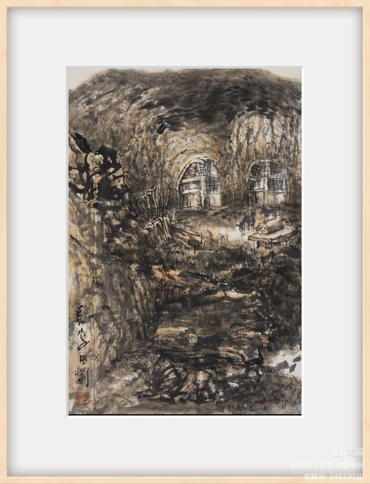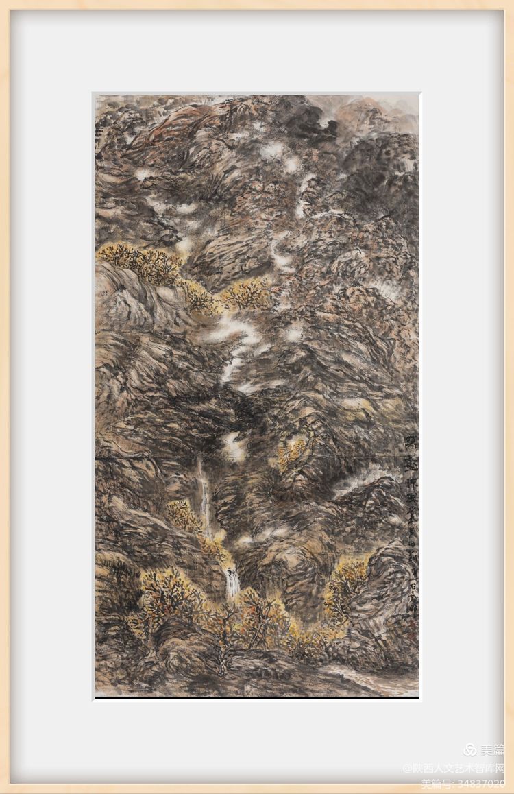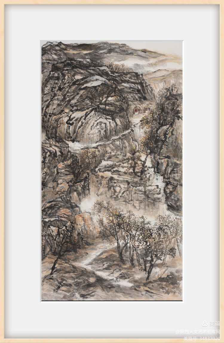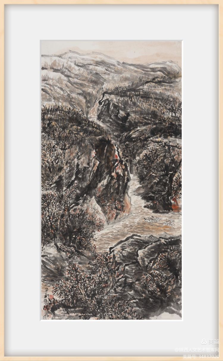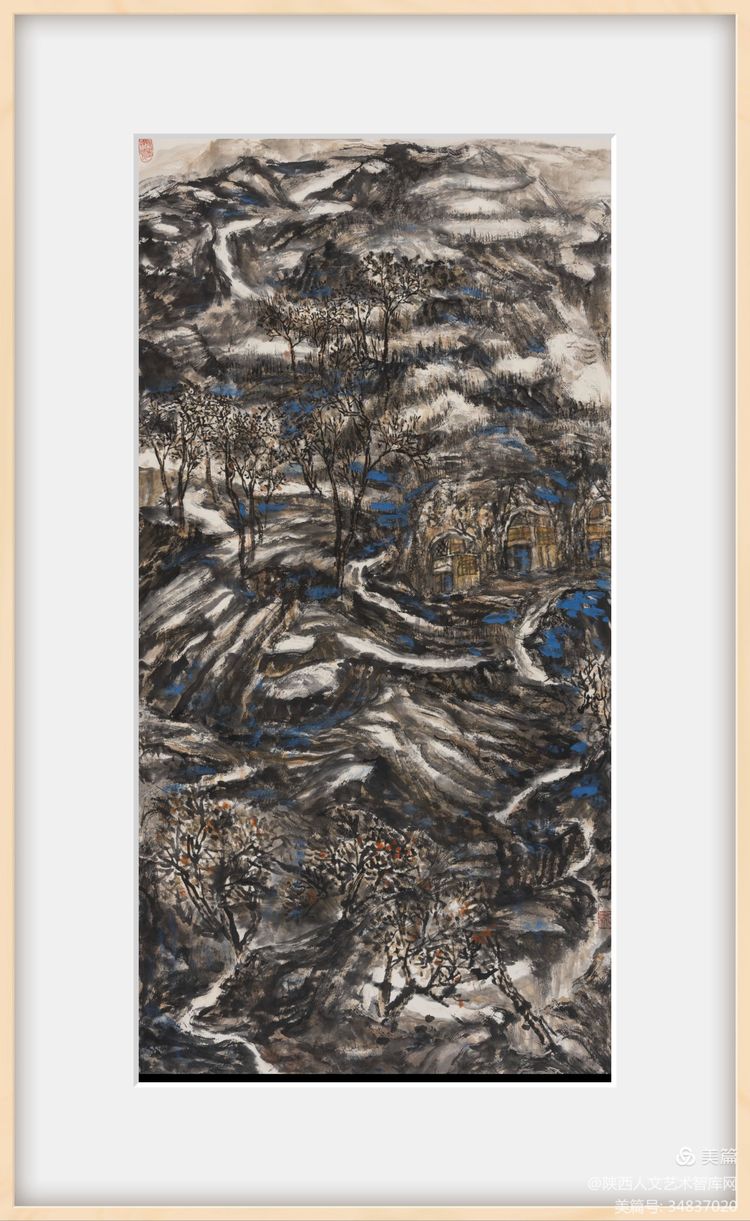 隨著畫家對自然美在認識上的不斷深入和發(fā)展,表現(xiàn)自然美的山水畫在筆墨技法上也有了相應的變化。中國山水畫傳統(tǒng)構圖形式有S型、z型、C型、三角型、三疊兩段式構圖等法則。黃土高原地貌獨特,溝壑縱橫,錯綜復雜。傳統(tǒng)構圖不易表現(xiàn)其開門見山之氣象。在創(chuàng)作中需考慮在傳統(tǒng)構圖的基礎上開創(chuàng)出新的構圖形式,宜采用平行,重復等手法方能體現(xiàn)出黃土高原單一中具重復,平行中具復雜的獨特地貌。我的作品《黃土風情》就是通過對黃土高原自然風貌的藝術處理,在傳統(tǒng)構圖的基礎上進行再思考的一幅山水之作。作品繪制精心,娓娓道來,采用自然樸實的筆墨語言描繪粗獷的陜北高原,賦予其雋永深長的意味。作品從不同視角表現(xiàn)高原、溝壑、黃土、窯洞、林木等景觀,三段式構圖分割構成整個作品的層次,近密遠疏,韻律感強。把陜北地域特征和生活氣息展示給觀者。近景山石泉樹關系融恰,遮擋有度,藏露,曲折,層次一一而出,畫意亦隨之而出。中景的窯洞是作品的靈魂,具有豐富的趣味,且異常醒目,成為視覺關注焦點,顯得重點突出,主次分明,因而更加引人入勝,雖沒有人物的出現(xiàn),卻是生生不息的生命力的最有力的表達,其間透露出更多的是一種生活化的構圖和審美趣味,使陜北高原風貌在山水畫中具有了更符合其特質的形式美。