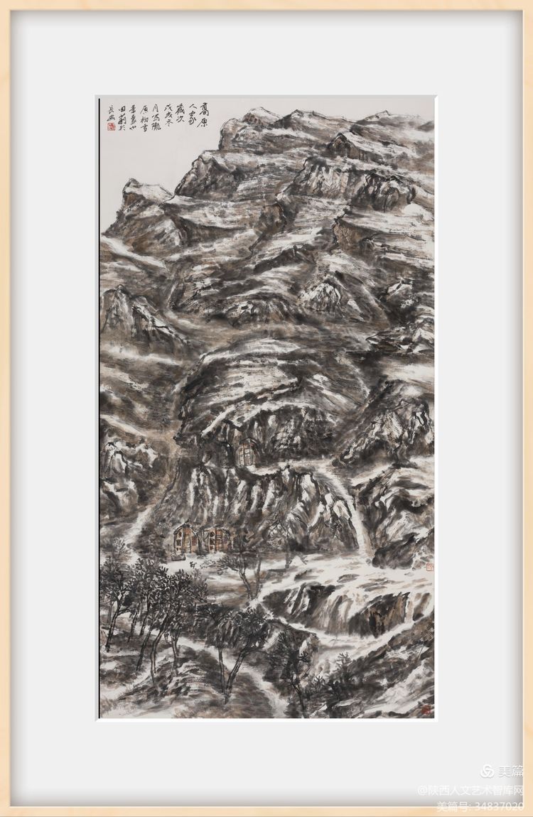 當然中國山水畫中的黃土高原還具有其他審美視角,藝術審美的多樣性豐富了藝術作品,同時也是藝術具備了創(chuàng)新性,而藝術的創(chuàng)作從某種層面來講在于新,黃土高原之所以能成為山水畫家筆底風景,就是因為其獨特的地貌和自然風光給了畫家一種新的美學啟示,激發(fā)了畫家在傳統(tǒng)繪畫的基礎上進行深度思考,用新的方式表現(xiàn)并提高藝術的思想性。即石魯先生所說的從藝術創(chuàng)作上的“新與美”而達到思想上的互動,心靈上的感動。這是因為“美術的思想性與審美觀是密切聯(lián)系的。造形藝術的思想,必須是通過內容與形式的統(tǒng)一于可視的形象而傳達給觀者。所以內容新而形式不美,常常使作品平庸無力,不能打動人心。當然,美不僅是形式,而且是內容。所以美不僅是純粹為欣賞的快感的滿足,而是具有陶冶和教育人的作用。只畫得逼真并不足為美,而真正的美感卻給人帶來精神上的高昂?!秉S土高原作為繪畫對象,顯示廣袤,悲壯的氣概,表現(xiàn)了人的精神,對人的審美起著默化作用,這里面最根本的問題是畫家的思想性。所以,時代對山水畫家的也提出了新要求,山水畫家不能僅是停留在對自我的修道、悟道的層級,更多的要從人與自然和諧共生的新時代命題去出發(fā)思考,去除人類中心主義,重建人與自然和諧與共的境界。